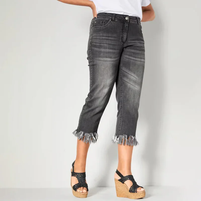 Capri jeans, slim fit, fringed hem, 5-pocket – Grey