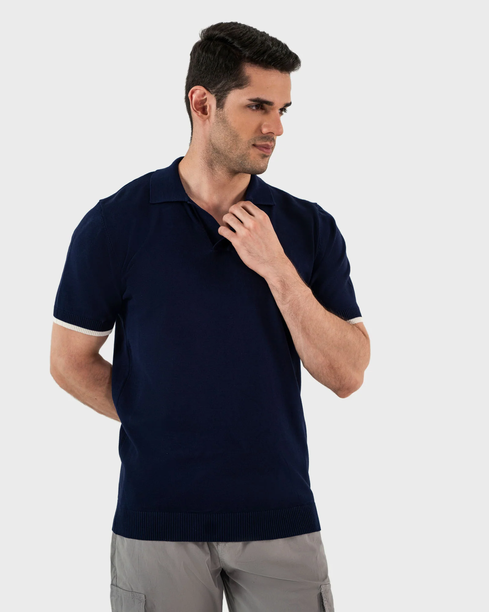 This men’s basic polo tee with tipping features soft sweater knit fabric, offering a cozy and textured feel. Its relaxed fit and subtle detailing make it perfect for casual wear with a touch of refined comfort.